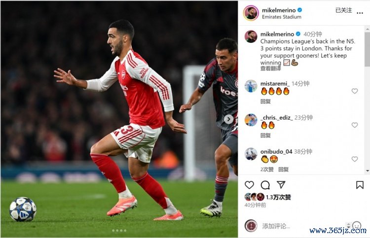 阿森纳中场梅里诺社媒晒出比赛相片,并写谈:“欧冠重回北五区,将3分留在伦敦。”