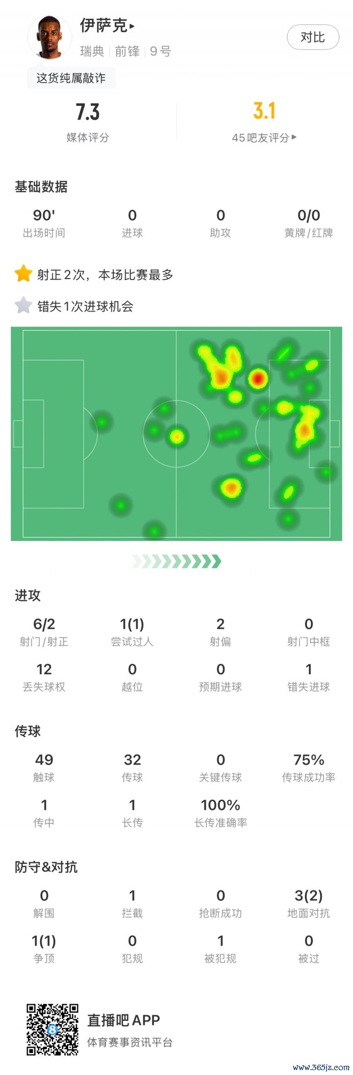 本场约克雷斯、伊萨克均首发打满全场,伊萨克全场6射2正0球,1次错失良机。约克雷斯数据为2射1正0球。