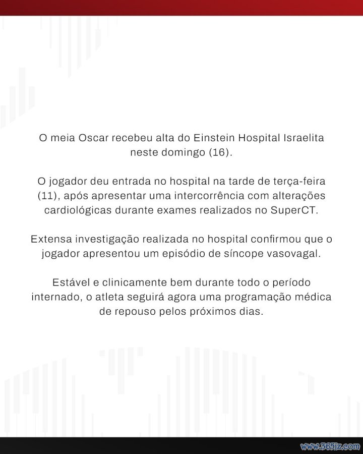 中场球员奥斯卡于本周日(16日)从以色列爱因斯坦病院出院。