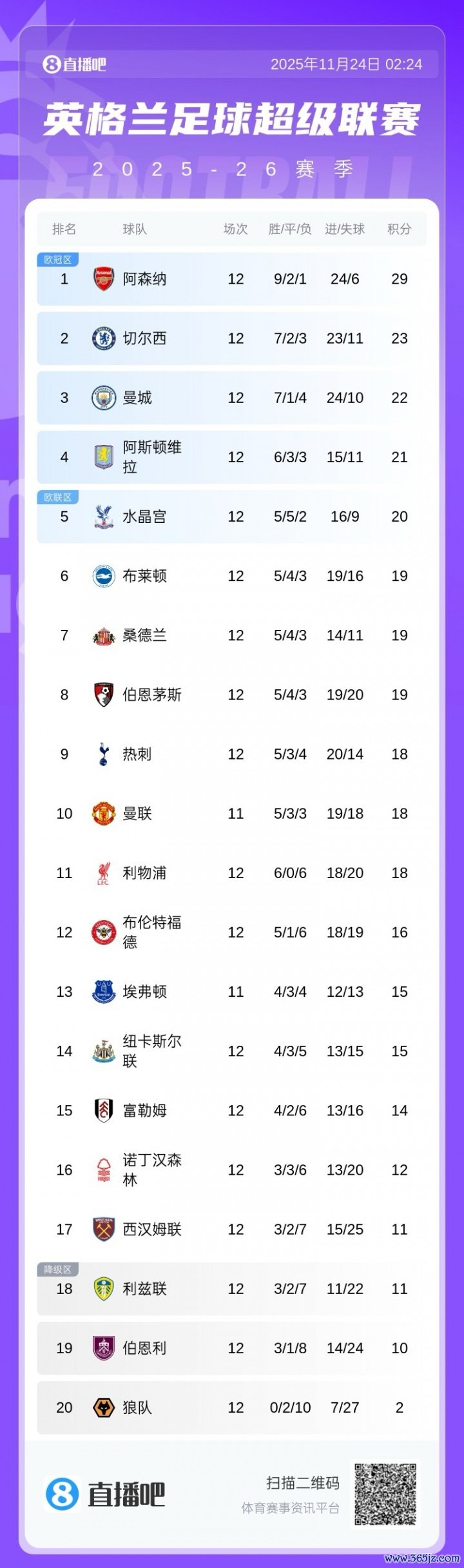 11月24日讯 本轮英超焦点战,阿森纳4-1大捷热刺。赛后英超夺冠赔率更新。