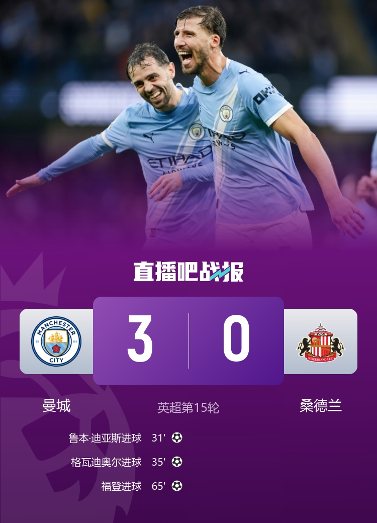 距榜首2分!曼城3-0桑德兰三连胜回第二 迪亚斯天下波谢尔基2助
