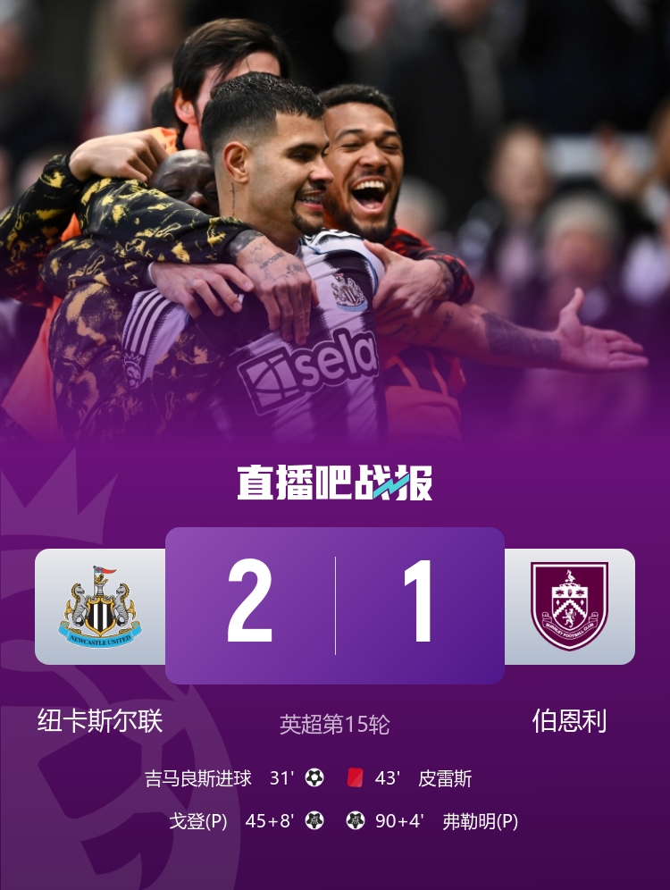 纽卡2-1打败伯恩利,吉马良斯角球径直破门,戈登点射。