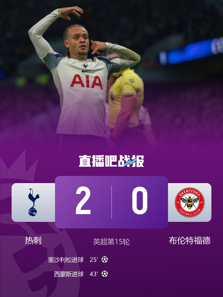热刺2-0打败布伦特福德,里沙利松、西蒙斯各入一球。