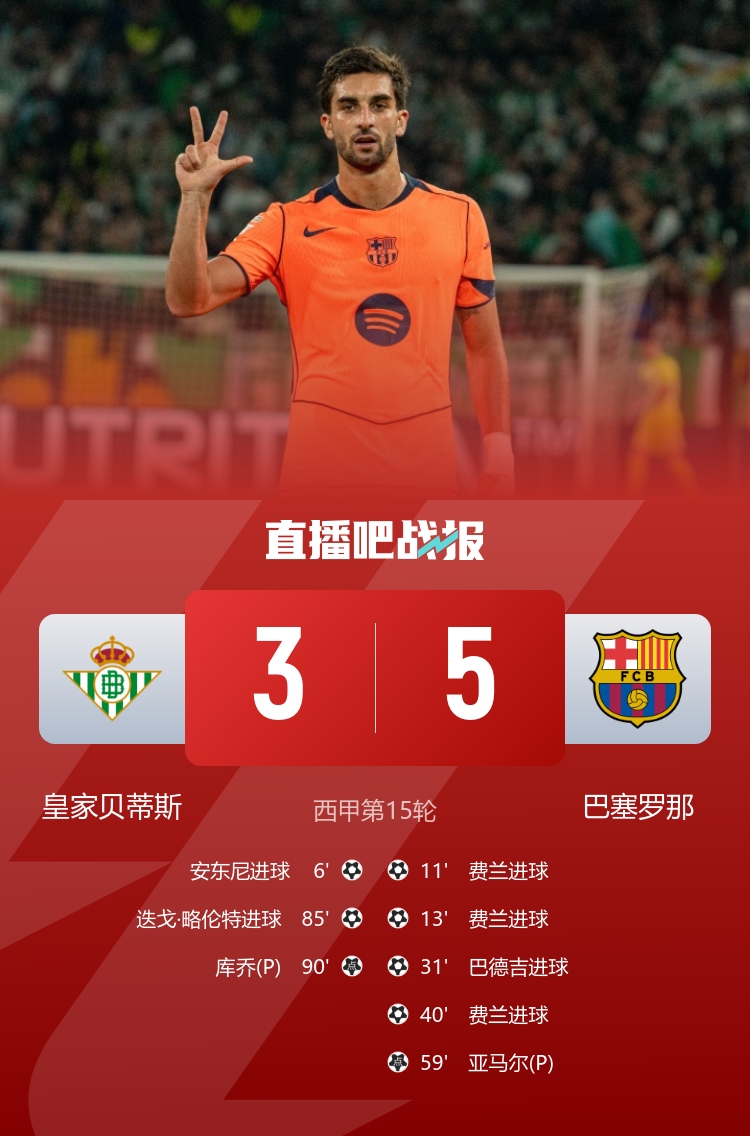 巴萨客场5-3打败贝蒂斯,先赛4分领跑!费兰本场戴帽。