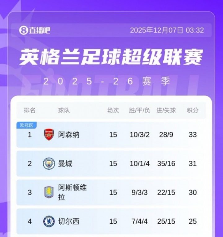 英超第15轮多场战罢,阿斯顿维拉2-1阿森纳,曼城3-0桑德兰,伯恩茅斯0-0切尔西,利兹联主场3-3利物浦。最新积分榜情况出炉。