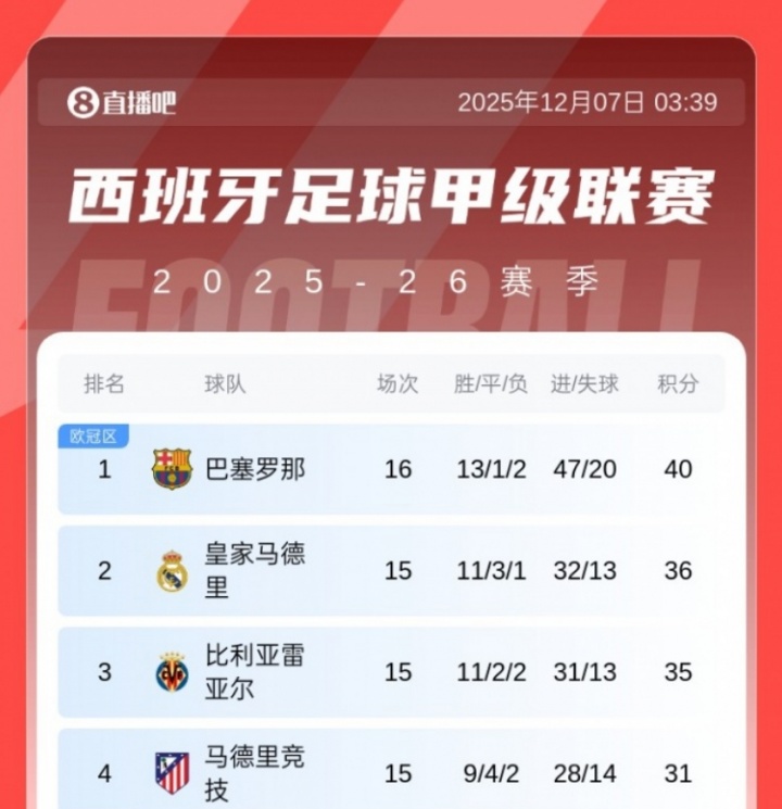 西甲积分榜:巴萨先赛4分上风领跑!皇马明晨迎战塞尔塔,马竞第4