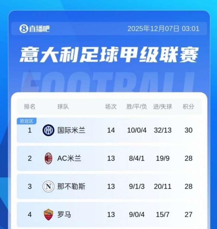 意甲积分榜:国米先赛暂2分上风领跑,未来那不勒斯vs尤文