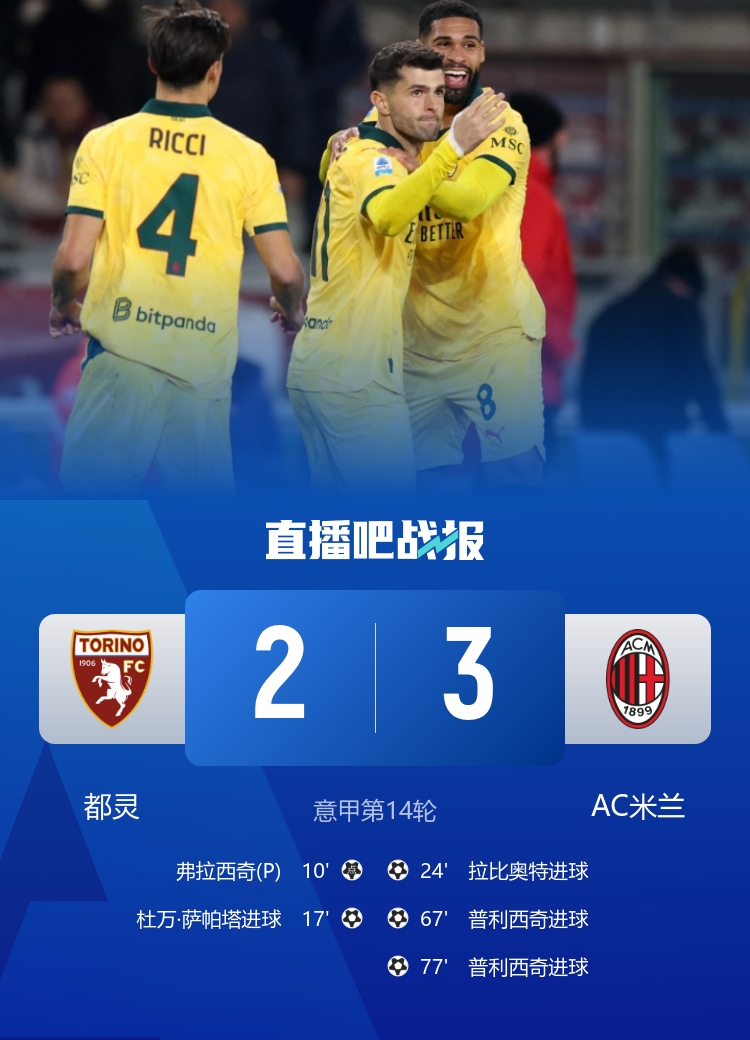 让二追三!米兰3-2都灵登顶榜首 普利西奇替补双响拉比奥特寰宇波