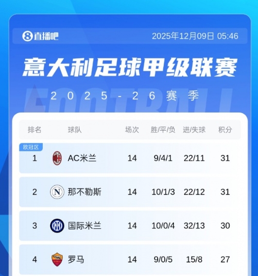 意甲积分榜:米兰重回榜首,与那不勒斯同分!国米30分第3罗马第4