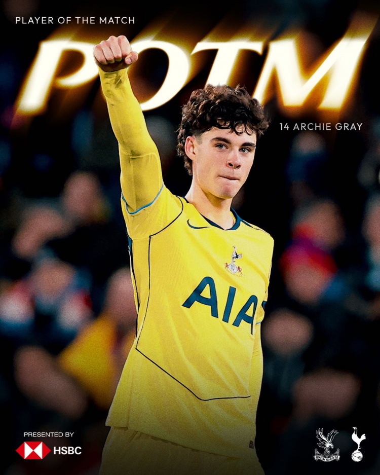 阿奇·格雷斩获劳动糊口一线队首粒进球2025年U20亚洲杯深圳,热刺官方布告,流程球迷的投票,他当选本场比赛队内最好球员。