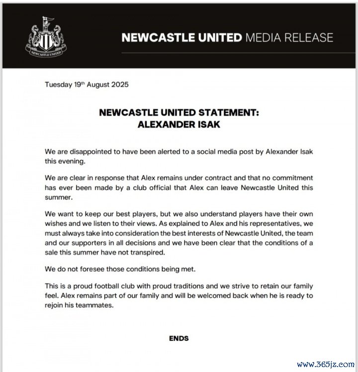 纽卡官方:从未欢跃伊萨克可在今夏离队,明确示意转会条目未达成