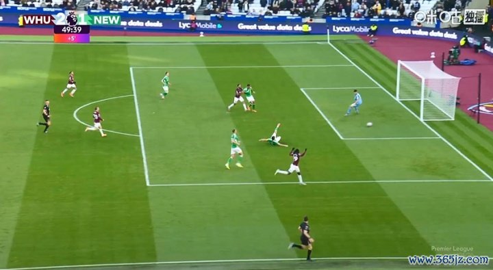 上半场补时阶段,万比萨卡边路传中,博特曼铲球突围变铲射,成功将球铲进自家大门,纽卡1-2过时西汉姆。
