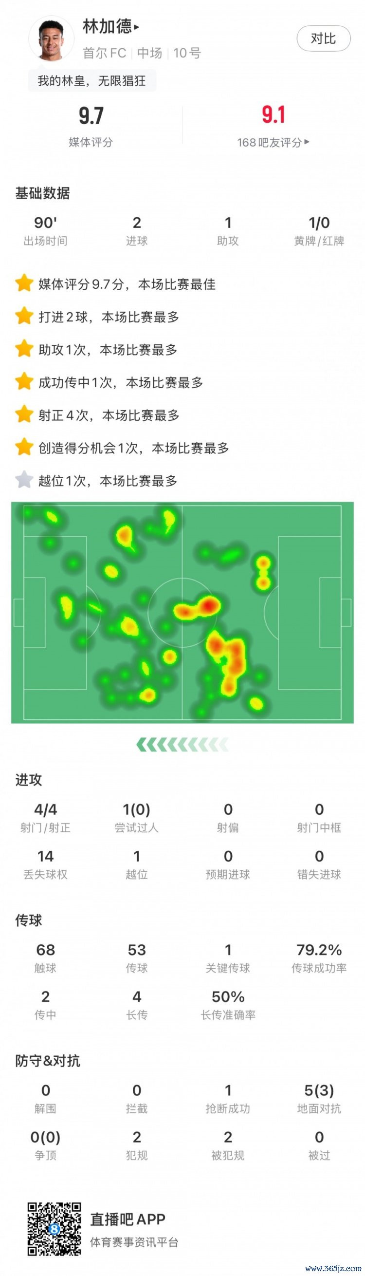 本场比赛“林皇”林加德平直参与首尔FC沿途进球,孝顺2射1传,赛后踢满全场的他取得了全场最高的9.7分。