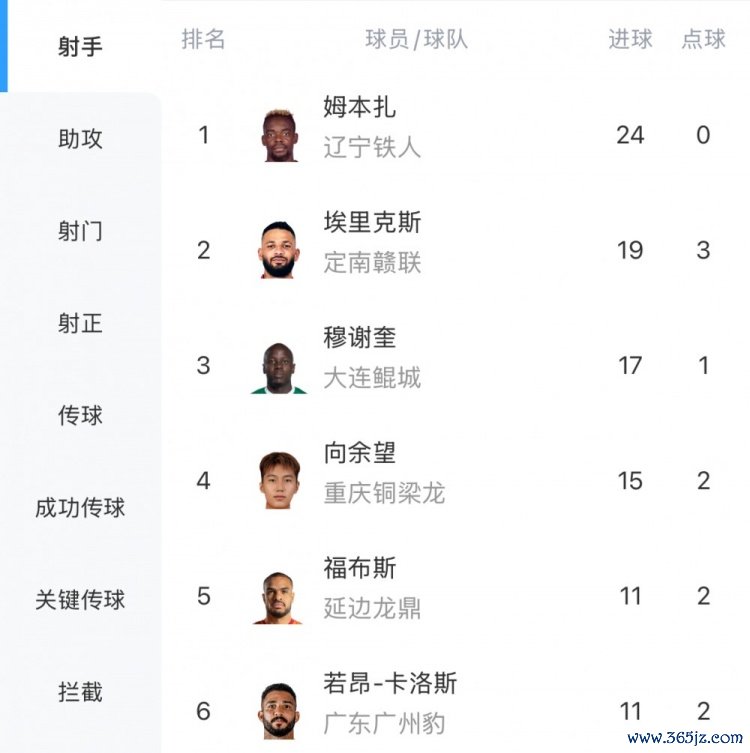10月6日讯 中甲联赛25轮战罢,弓手榜方面,本轮双响的姆本扎24球领跑,本轮分离进球的埃里克斯和向余望分居第二和第四位。