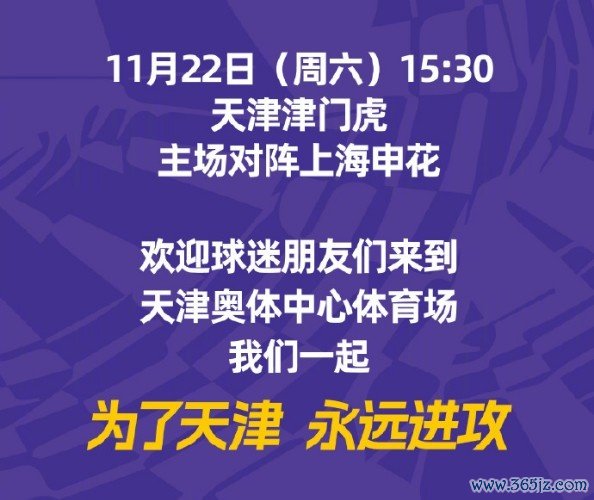 11月22日(周六)15:30,天津津门虎将在天津奥体中心畅通场迎战上海申花,开票技巧为11月14日中午12点。