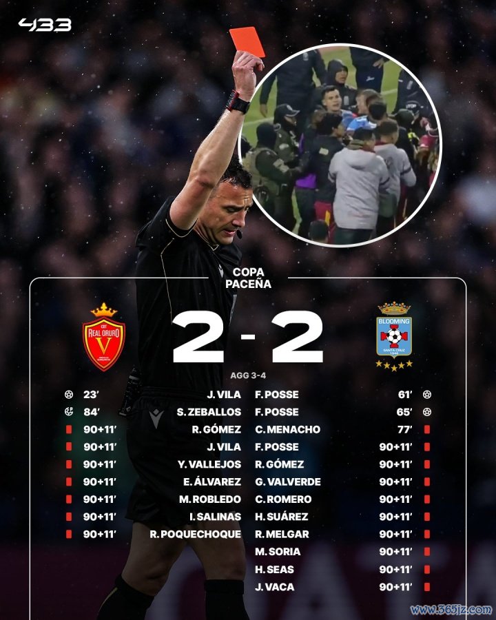 11月28日讯 据玻利维亚媒体报说念,玻日比杯次回合一场比赛后,两边球员爆发大冲破,共有17东说念主吃到红牌。