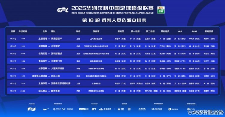 7月26日讯 中超官方公布了第18轮评判员法则名单,王竞主哨成王人蓉城vs北京国安、张雷吹山东泰山vs梅州客家、梁松尚吹上海申花vs河南队。