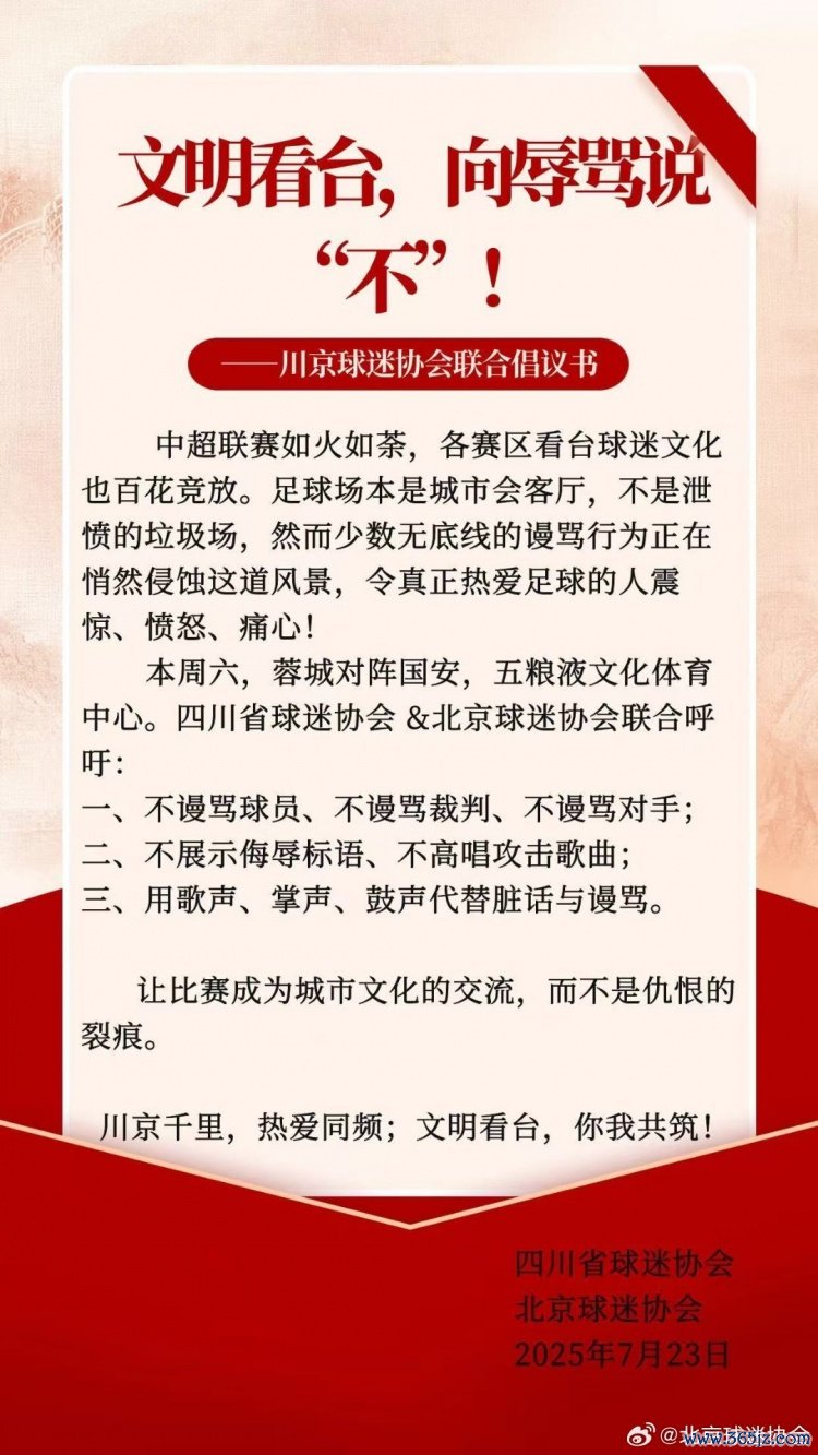 7月26日讯 今晚,中超联赛第18轮,成王人蓉城将在主场对阵北京国安。赛前,川京球迷协会邻接倡议书:文雅看台,向吊问说“不”!