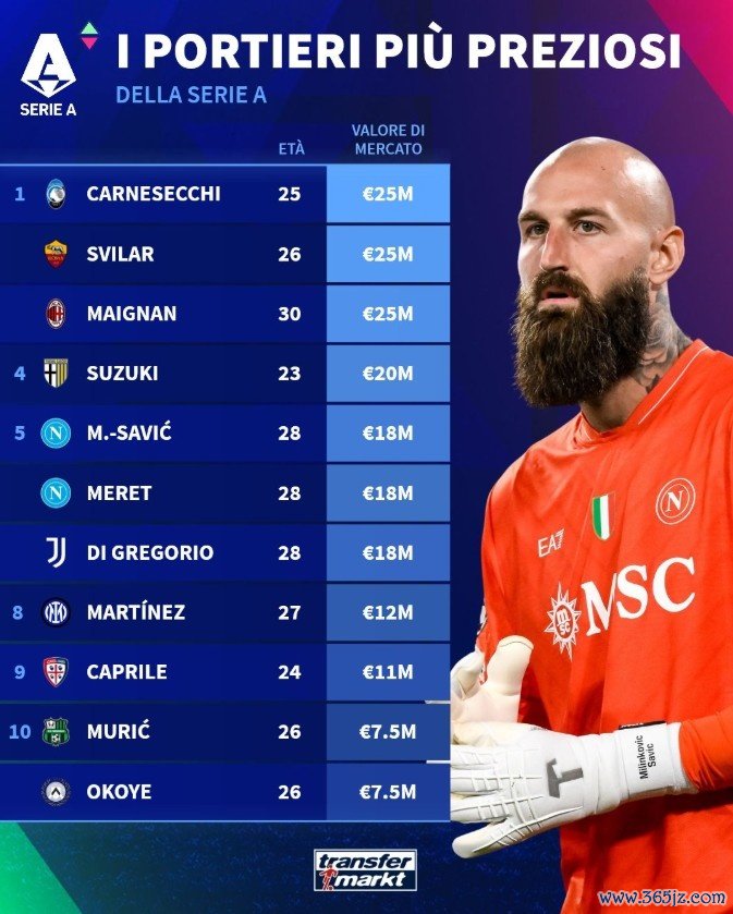 10月9日讯 德国转会商场公布了意甲门将最新身价情况,卡内塞基、斯维拉尔和迈尼昂以2500万欧并排最高。