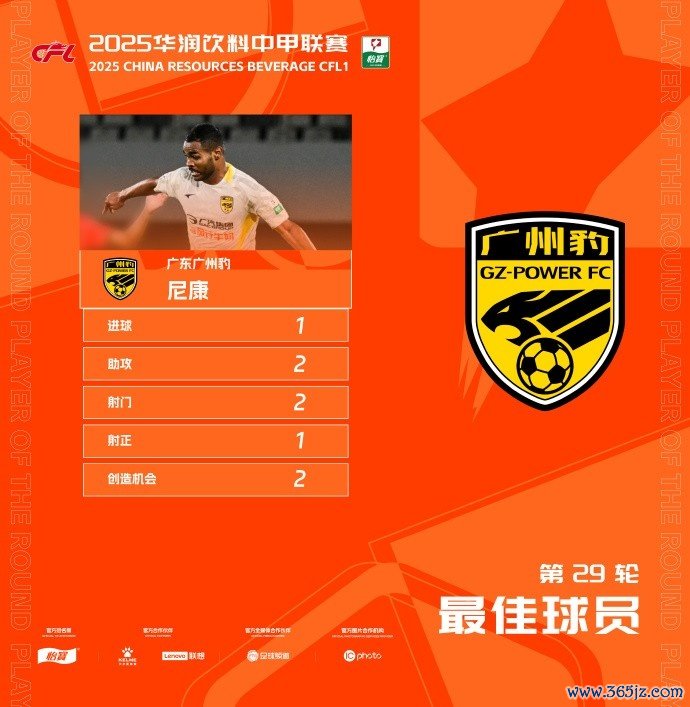 11月6日讯 官方音讯,广东广州豹中场尼康当选中甲第29轮最好球员。
