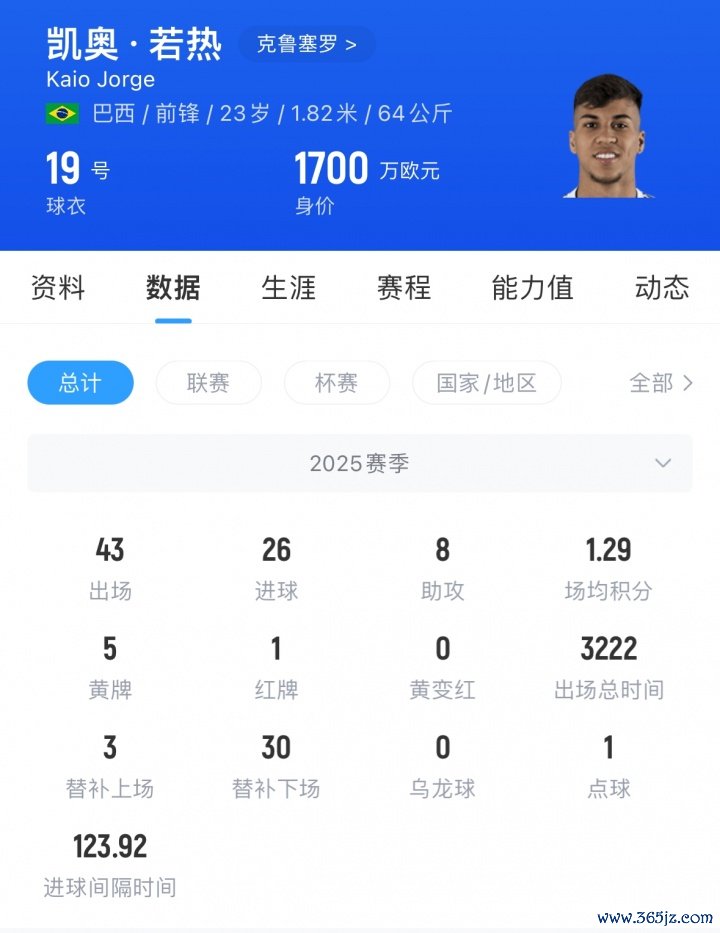 23岁的若热本赛季为克鲁塞罗出场43次,已孝敬26球8助攻,现时领跑巴甲弓手榜。