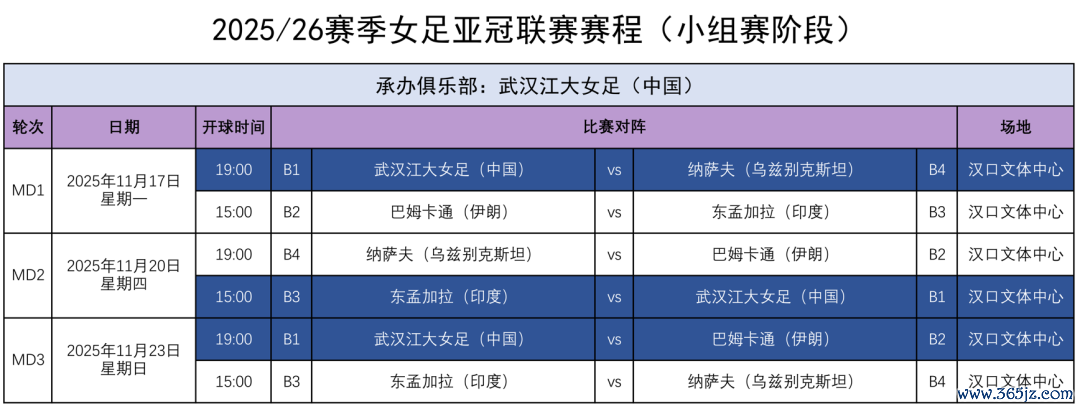 今天,中国足协刚刚发布了《对于2025/26赛季女足亚冠联赛赛程的秘书》,证据新一届女足亚冠将于2025年11月开启。行为2024赛季女超联赛冠军暨2024/25赛季女足亚冠冠军,武汉江大女足将代表中国获胜进入小组赛,并经办B组赛事,比赛场地为汉口文学中心。