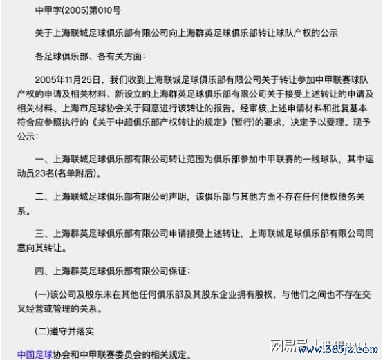 “2004年上海九城进入了中国足球乙级联赛,以不败收获夺得冠军,赢得次年中国足球甲级联赛的参赛履历。2005年4月,球队更名为脱离了任何组织机构的中性称呼上海联城,以示‘协作友好’的宅心,然则临了莫得省略冲入中超。年底,朱骏收购了中超球队上海中邦,而将俱乐部转让。”
